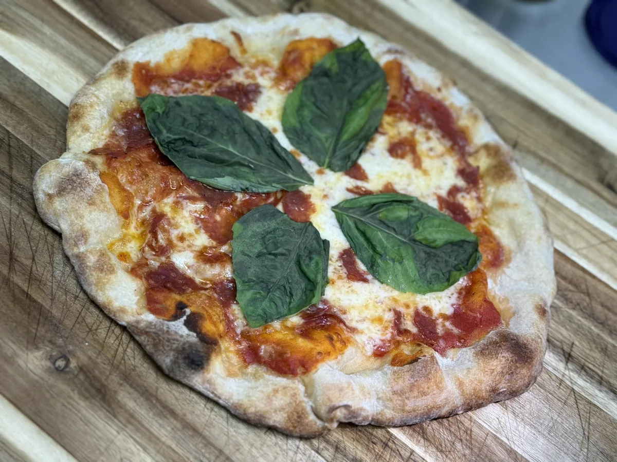 Simple and classic. Red sauce, fresh basil, mozzarella, and soppressata. A true Italian favorite.